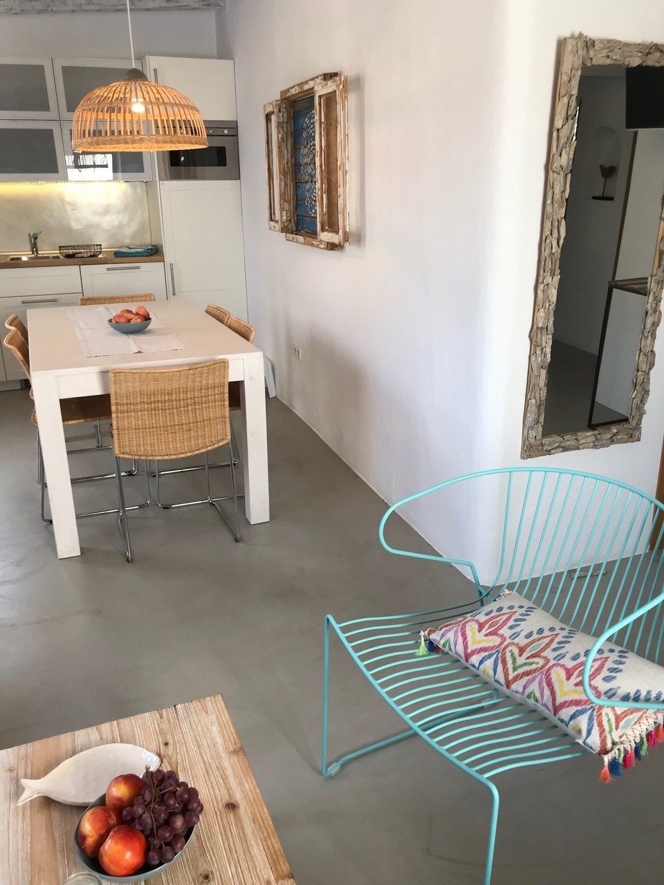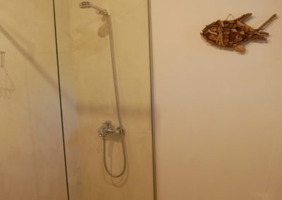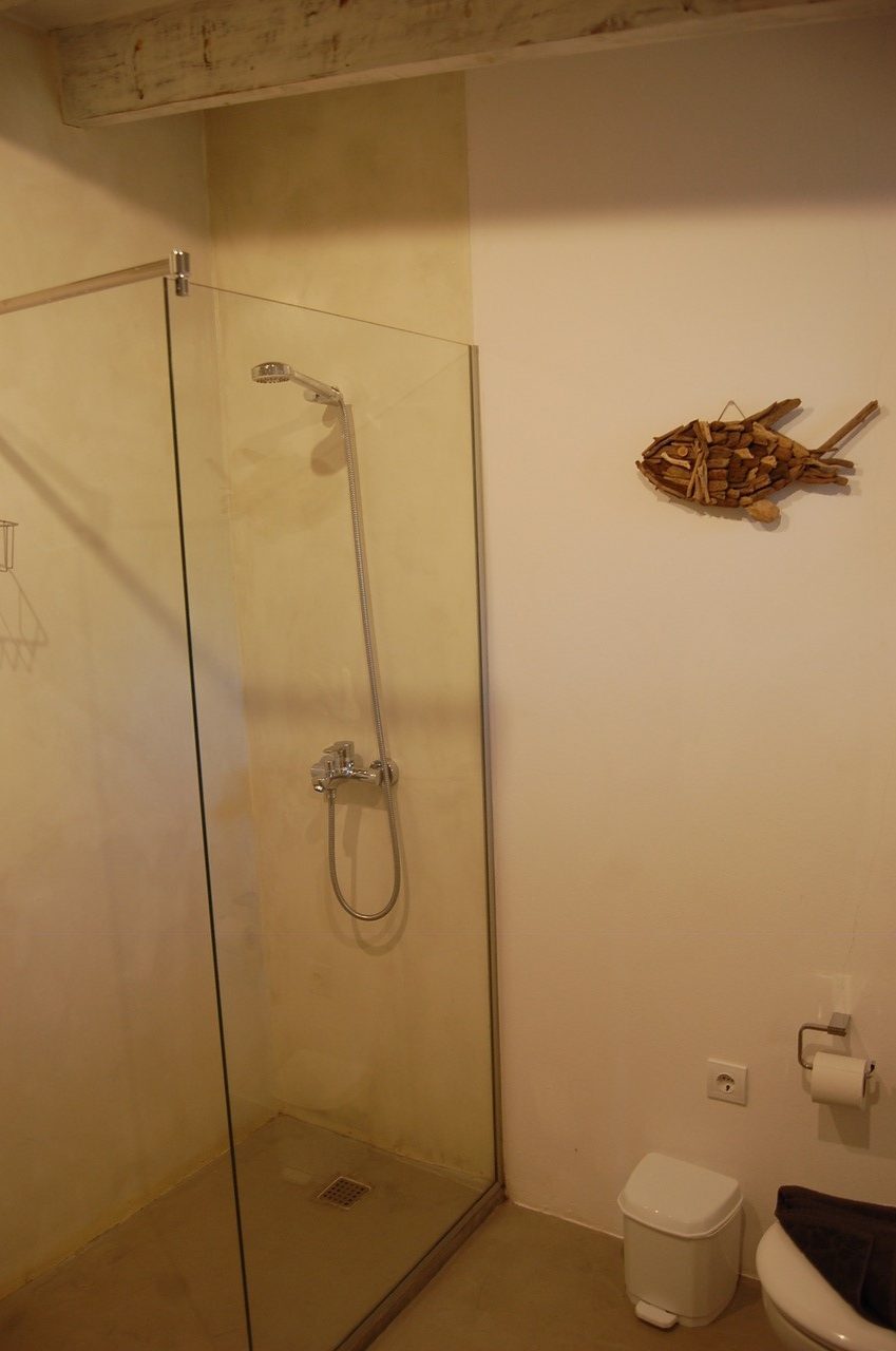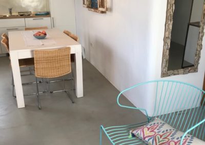 The resin floor and the wooden beams gives this area a warm and silky touch. From the internal patio, equipped with table and chairs for outdoors dinner, we have finally accces to an indipendent third double bedroom with bathroom en-suite.